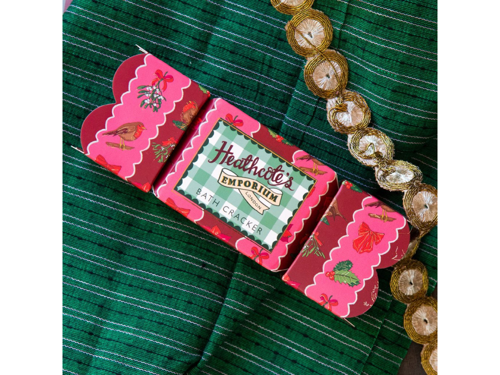 Vneste do vánočních dnů špetku kouzla, vůně a šumivé radosti s dárkovým crackerem Heathcote’s Emporium, ve kterém se ukrývají tři růžové bomby do koupele. Při rozpouštění se uvolňuje bohatá, uklidňující vůně eukalyptu, levandule a pačuli, jemně doplněná svěžími tóny zelených listů, konvalinky a hřejivého santalového dřeva. Složení s výtažkem z květů tulipánu a glycerinem zanechá pokožku hebkou a hydratovanou, zatímco voda získá jemný růžový odstín.