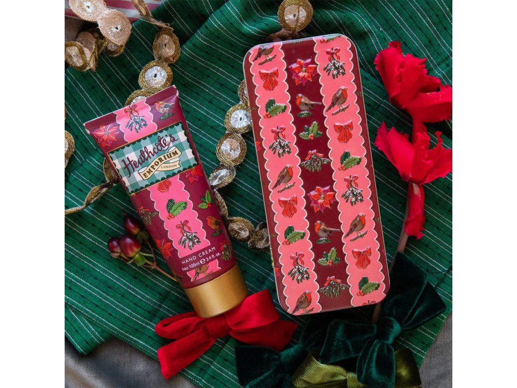 Luxusní krém na ruce Heathcote & Ivory z kolekce Heathcote’s Emporium přináší bohatou péči a kouzelnou vánoční atmosféru v jednom. Je uložen v plechové dóze s ručně malovanými motivy vánočních mašlí, jmelí, cesmíny a ptáčků.