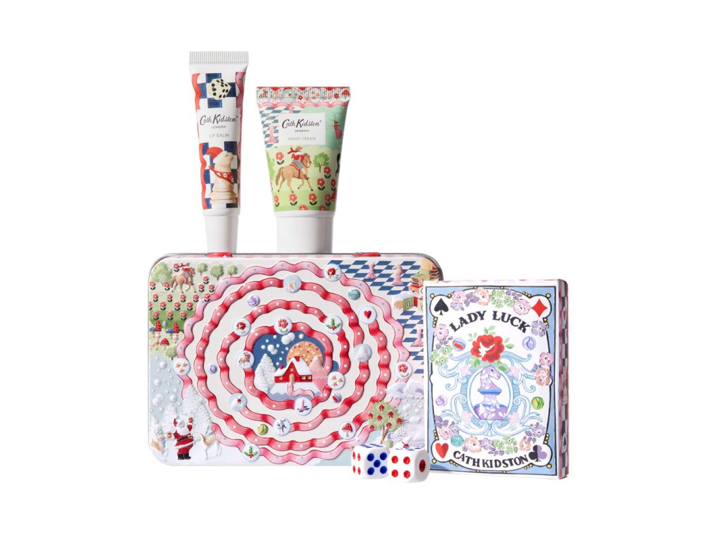 Otevřete víko a nechte se přenést do kouzelného vánočního světa Cath Kidston, kde se mísí hřejivá atmosféra svátečních večerů s radostí ze společných her. Uvnitř na vás čeká krém na ruce s bohatým bambuckým máslem a vitaminem E, který promění suchou pokožku v hedvábně jemnou a provoní ji směsí červených bobulí, cedrového dřeva, jehličí a sladkého kandovaného cukru. Vyživující balzám na rty s krémovou vůní vaječného koňaku dodá rtům péči i jemný lesk.