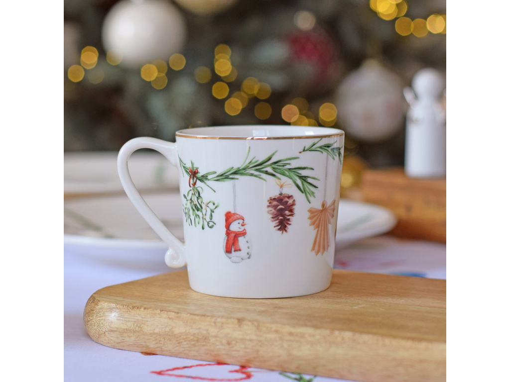 Tento krásně tvarovaný hrneček z porcelánu je dekorovaný tradičními vánočními ozdobami po celém svém obvodu. Jako punc neobyčejného vzhledu tvoří zlatá linka na okraji hrnku.