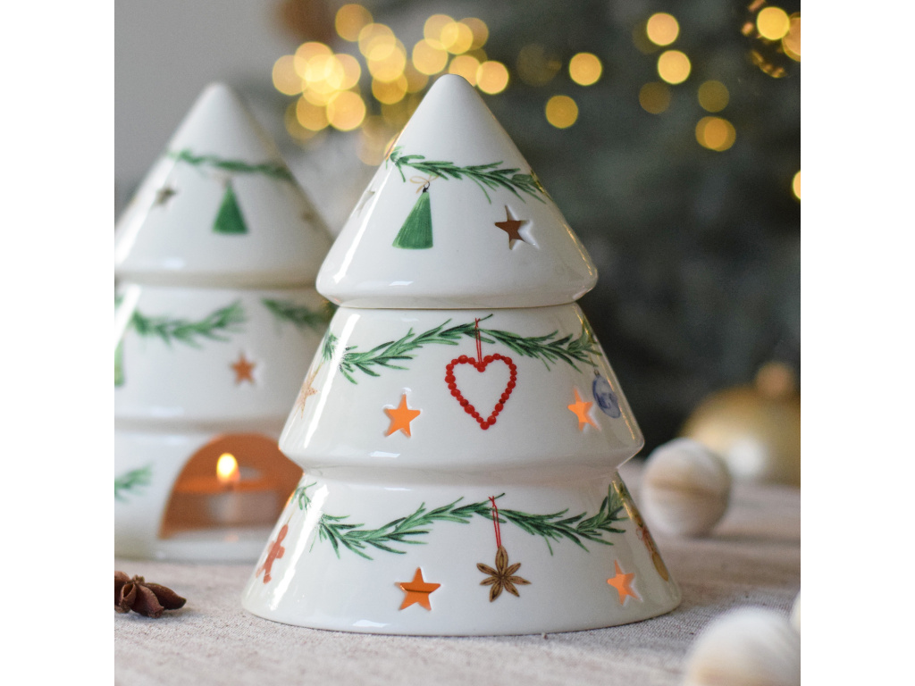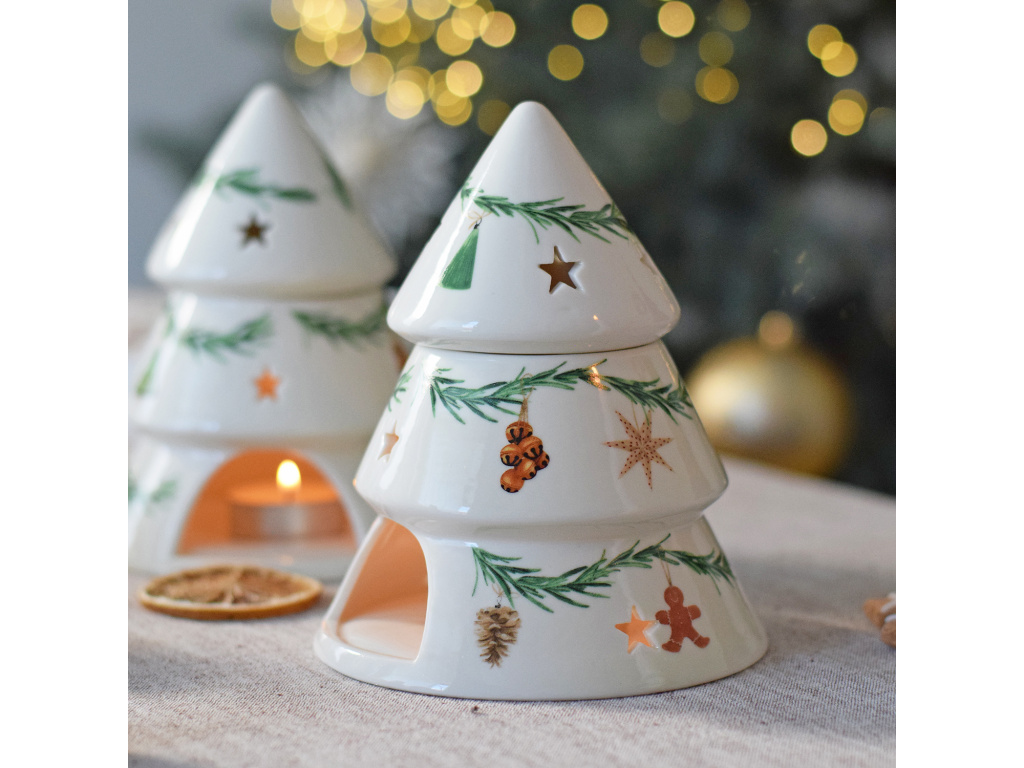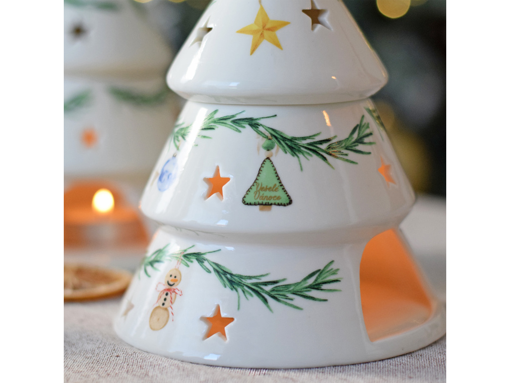 Tato porcelánová aromalampa ve tvaru vánočního stromečku okouzlí svým designem i vůní, kterou navodí. Skládá se ze dvou částí – špička stromku se snadno oddělá a do mystičky uvnitř můžete přidat vonný olej nebo vosk. Navíc krásně prosvítá světlo svíčky skrze hvězdičky po celém obvodu.