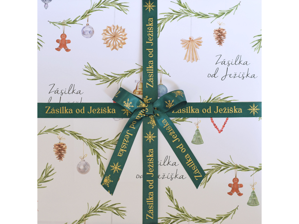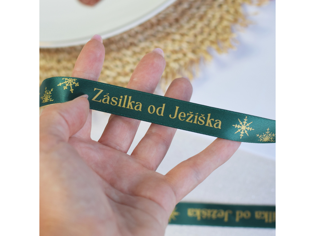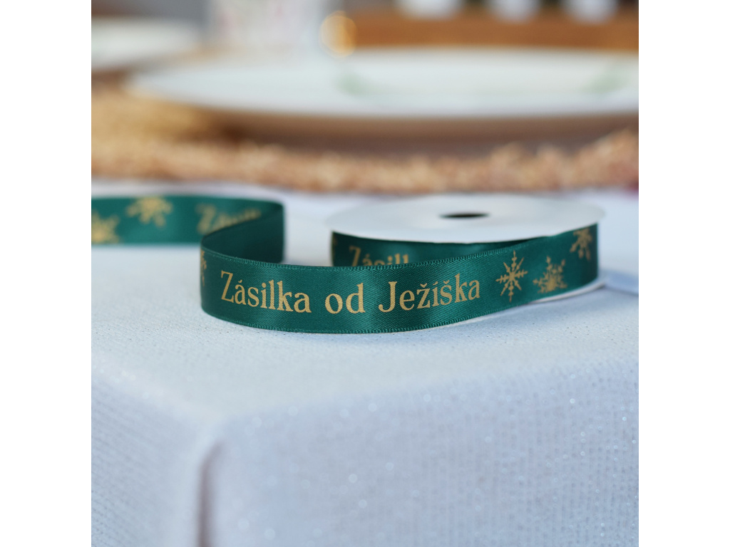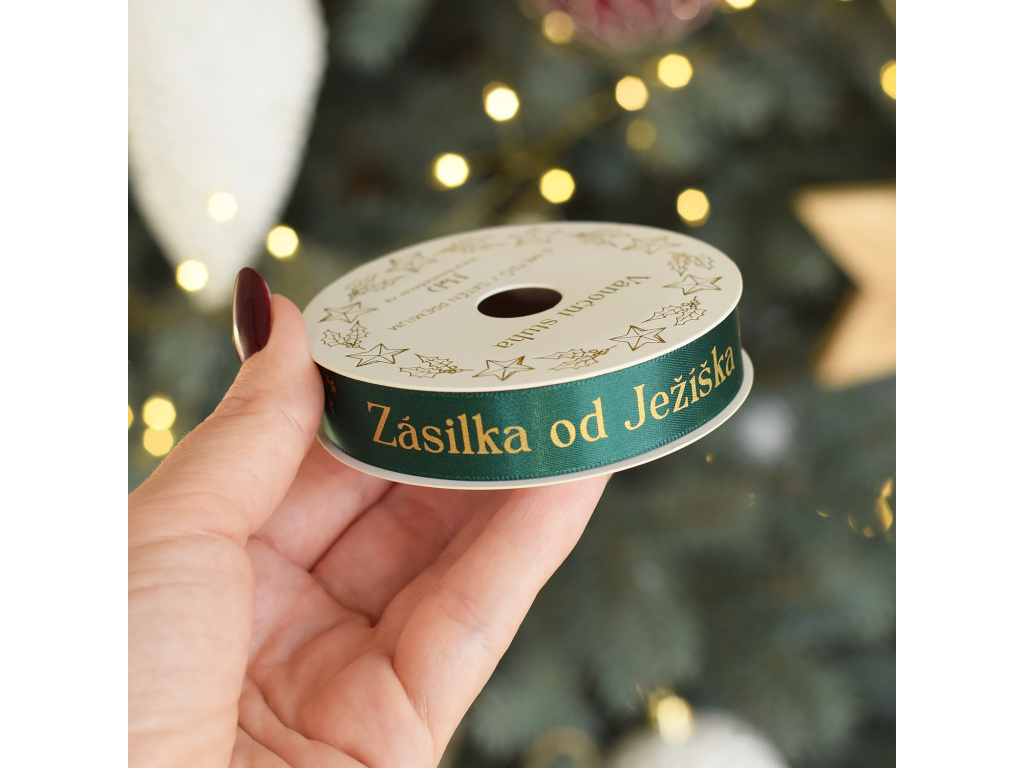 Tato prémiové stuha s českým nápisem je naprosto úžasný doplněk pro všechny dárky. Saténovou stuhu v tmavě zeleném vánočním odstínu zdobí český nápis ve zlaté barvě "Zásilka od Ježíška" a zlaté vločky.
