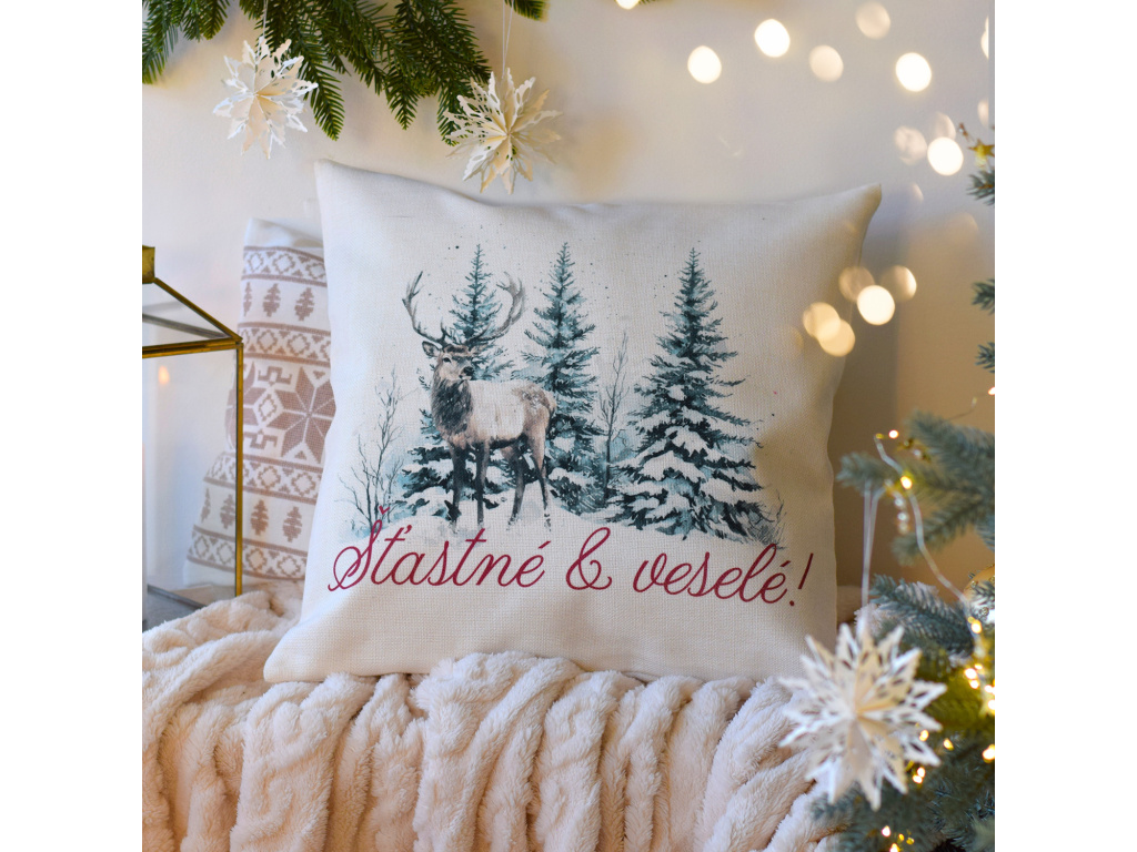 Vytvořte si doma útulnou vánoční atmosféru a doplňte si interiér o polštář s českým textem a motivem zimní krajiny s jelenem.