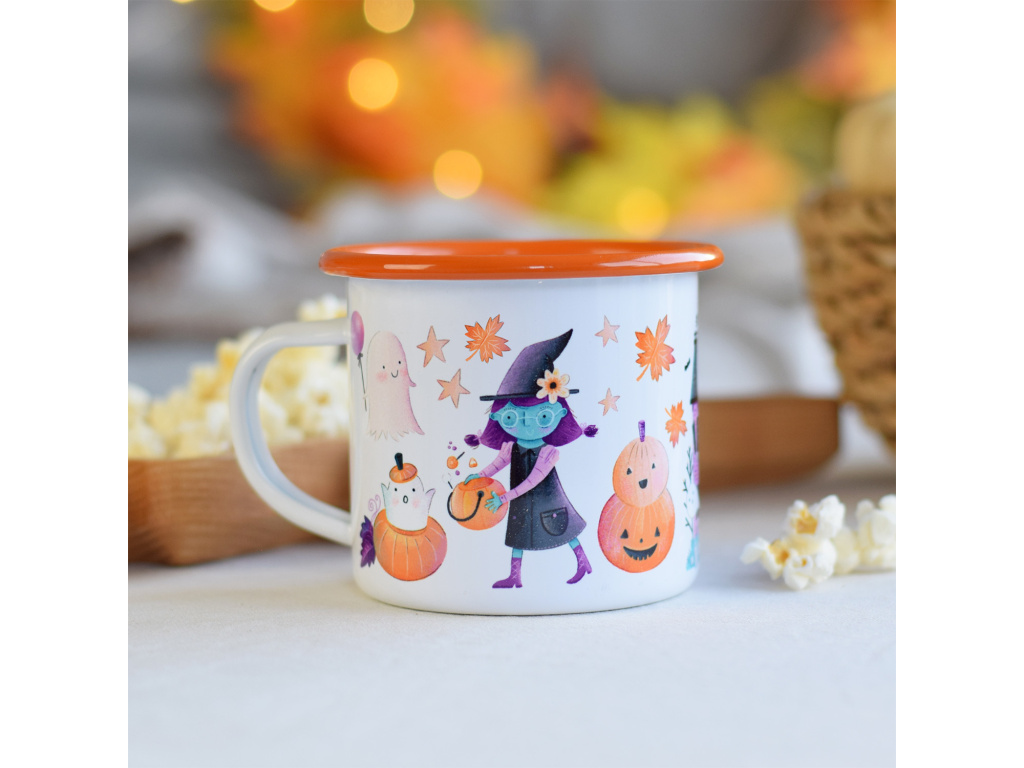 Hrnek je dekorován po celém povrchu. Nechybí zde čarodějnice, sova, duch a nebo spousta veselých dýní!