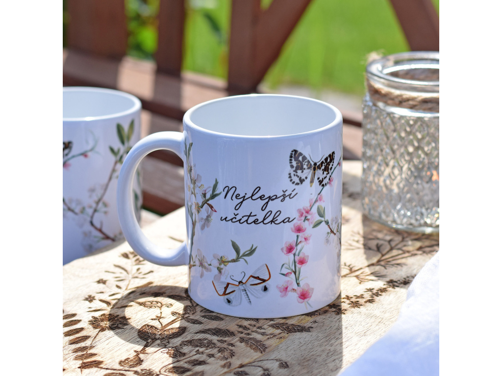 Pokud hledáte vhodný dárek pro paní učitelku, pak popřemýšlejte i o tomto hrnku s potiskem. Jemný a decentní motiv květin s motýly je skvělým dárkem, kterým jistě paní učitelku potěšíte.