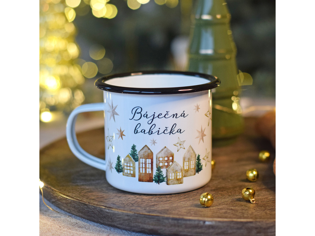 Krásný plecháček s nápisem „Báječná babička“ potěší každou maminku, která si ráda vychutná svou oblíbenou kávu, čaj nebo horkou čokoládu v útulné atmosféře. Jemný design s motivem zimních domků a hvězdiček dodává hrnečku kouzelný sváteční nádech.