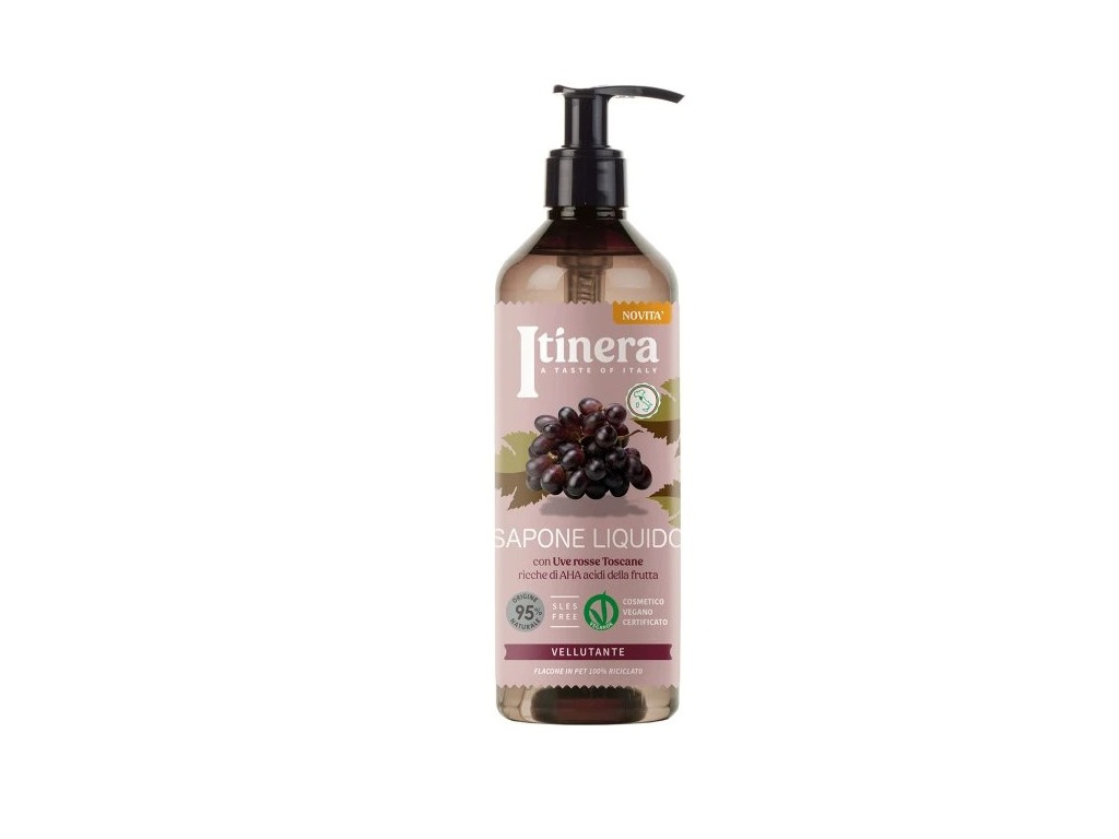 Dopřejte pokožce rukou luxusní péči s Itinera tekutým mýdlem, obohaceným o extrakt z toskánských červených hroznů s obsahem AHA kyselin, které jemně čistí a zároveň vyhlazují pokožku. Díky složení s 95 % přírodních složek, včetně extraktu z aloe vera a glycerinu, mýdlo nejen dokonale myje, ale také hydratuje, zklidňuje a chrání pokožku před vysoušením. Tóny koření, mošusu, ovoce a vanilky promění každé umytí rukou v příjemný smyslový zážitek.