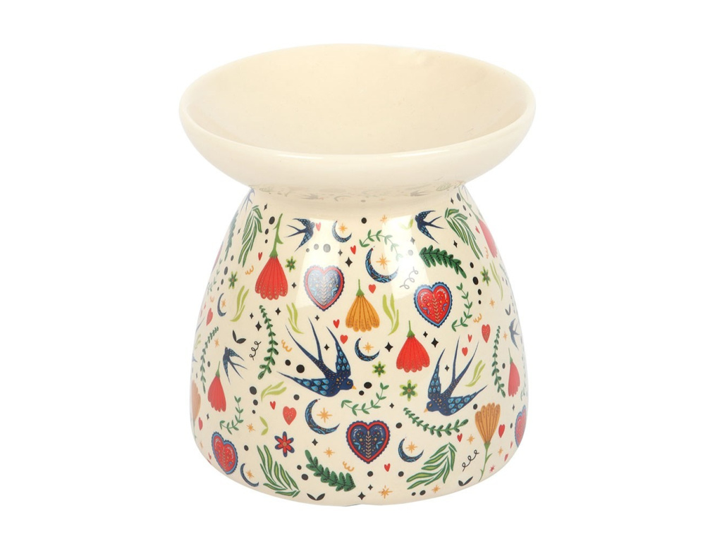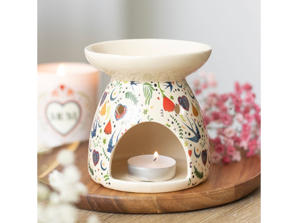 Tento krémově keramický olejový hořák má jemný květinový design, což z něj činí praktický i dekorativní doplněk každé místnosti. Stačí umístit jednu standardní čajovou svíčku do prostoru vzadu a přidat pár kapek zředěného vonného oleje nebo vosku do misky. Vhodné pro použití jak s voskem, tak s vonným olejem. Nikdy nenechávejte zapálenou svíčku bez dozoru.