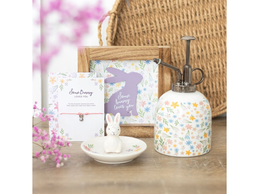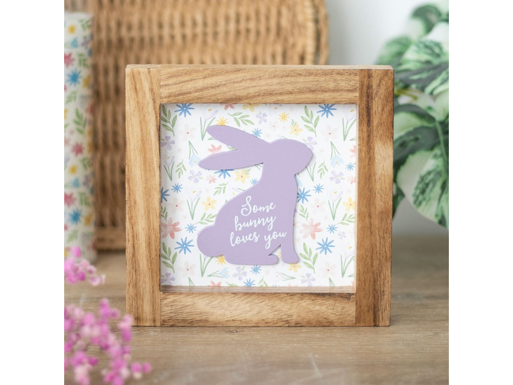 Obsahuje fialový obrys králíka s nápisem 'králíček tě miluje' na květinovém pozadí, což je ideální pro přidání špetky hravosti do domova v týdnech před Velikonocemi.
