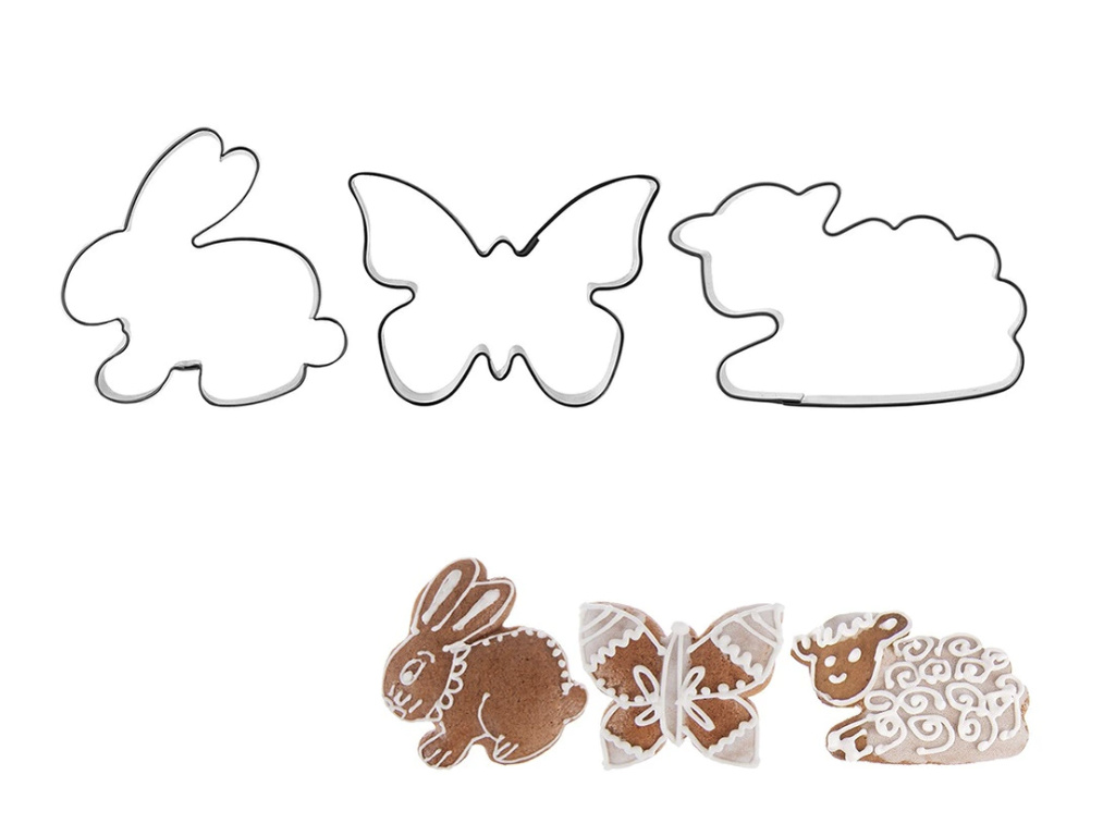 Sada tří vykrajovátek na sušenky ve tvaru zajíčka, motýla a jehňátka. Jsou vyrobeny z nerezové oceli a jsou ideální na sušenky a perník.