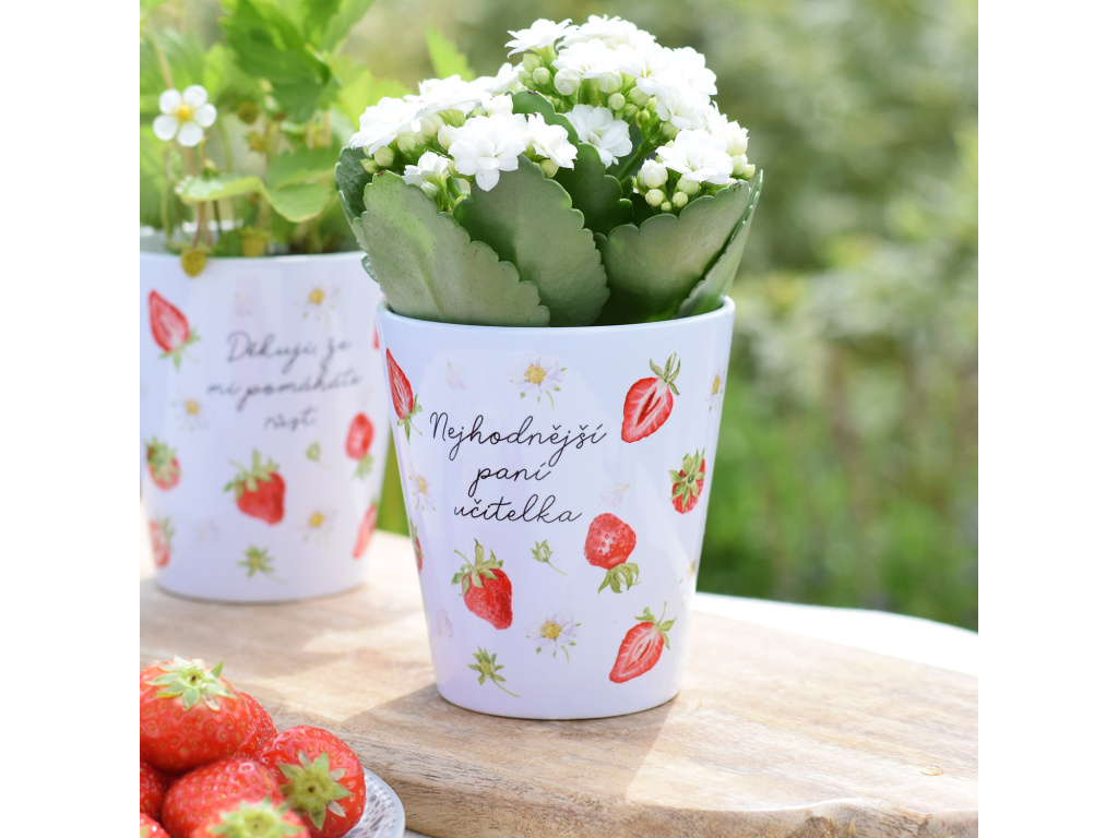 Květináček Jahoda - Nejhodnější paní učitelka Do těchto květináčků se budete chtít zakousnout! Motiv červených jahůdek potěší každou paní učitelku a rozzáří jí den.   Vyberte tento roztomilý dárek. Stačí už jen vybrat pěknou kytičku nebo bylinku, kterou do květináčku posadíte. velikost: 10 x 9 cm materiál: keramika MOHLO BY VÁS ZAJÍMAT : ➤ Dárky pro učitelky/učitele ➤ Květináčky ➤ Dekorační zápichy ➤ Květiny
