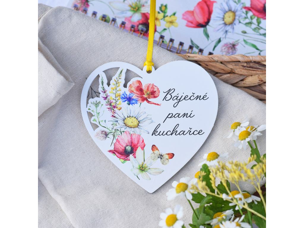 Srdce Česká louka - Báječné paní kuchařce Krásné kolekce vyřezávaných srdíček tvořená jako dárek ke konci školního roku. Pokud hledáte drobný dárek, kterým se zavděčíte, pak tyto srdíčka jsou jistě to pravé. Krásné zpracování, kvalitní a pestrý tisk, výběrové citáty - To jsou tyto srdíčka dekorovaná motivem s názvem Česká louka. Na výběr je hned několik citátů. Chcete potěšit paní učitelku, paní ředitelku, vychovatelku nebo i paní kuchařku? To už necháme na Vás. TIP - Tyto srdíčka můžete doplnit o zápisník, čaj, květináček, hrneček, ale i přání ve stejném motivu! Velikost: 10 x 10 cmDoplňkové parametry