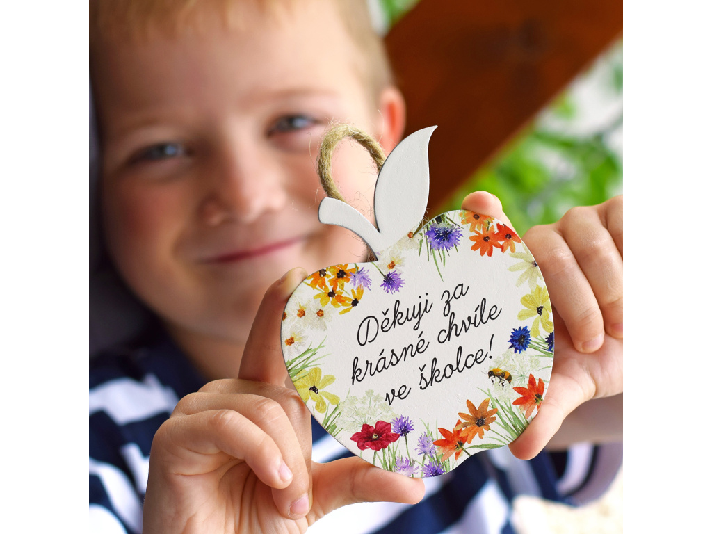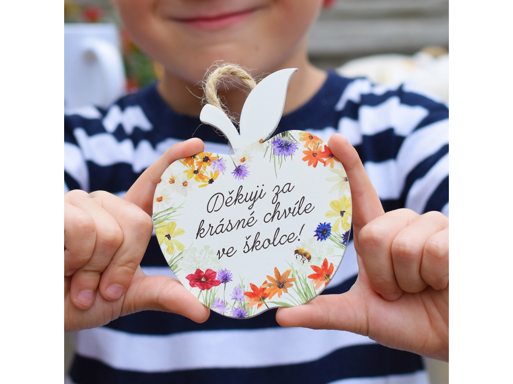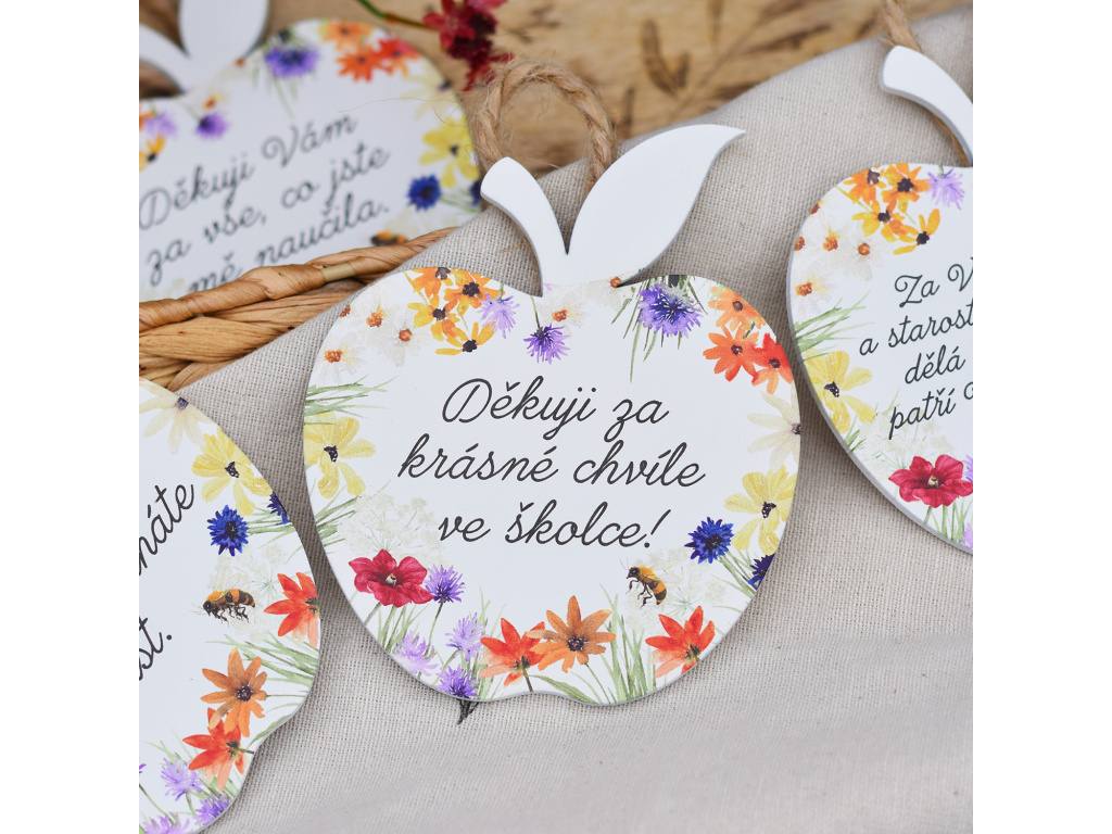 Dřevěné dárkové jablíčko s barevným potiskem a českým citátem. Tyto dřevěná jablíčka jsou milým a drobným dárkem ke konci školního roku.