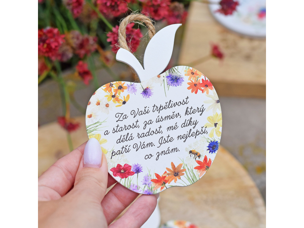 Dřevěné dárkové jablíčko s barevným potiskem a českým citátem. Tyto dřevěná jablíčka jsou milým a drobným dárkem ke konci školního roku.