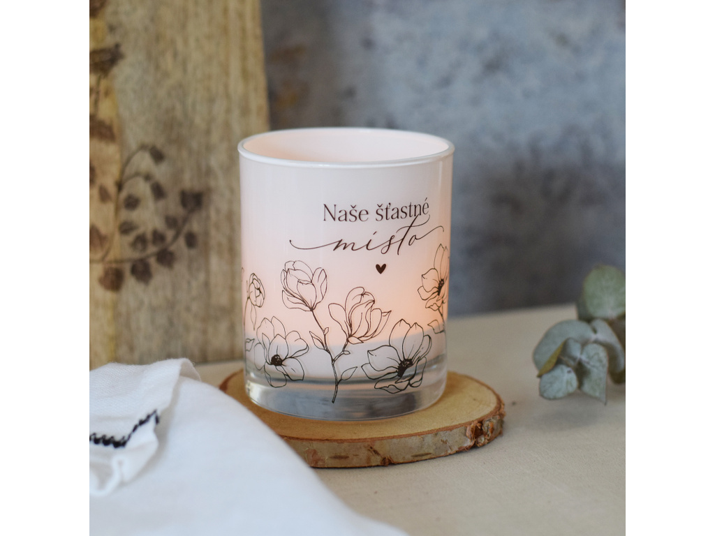 Svícen z mléčného skla zdobený trendy květy magnólie doladí váš interiér nebo jej můžete věnovat jako originální dárek.