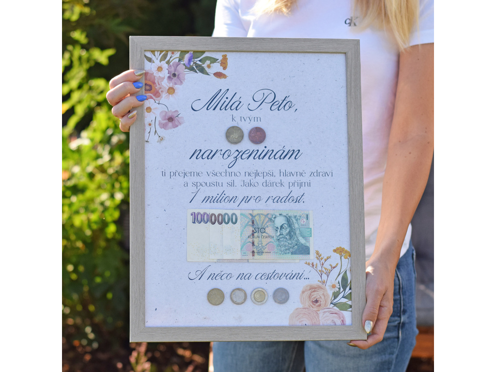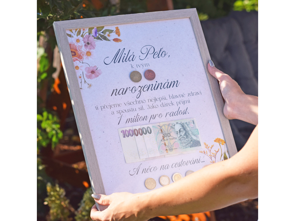 Darujte k narozeninám úžasný dárek, ze kterého budou všichni unešeni! Darování tohoto obrazu je opravdu skvělým způsobem jak elegantně předat 1 milion korun. Využijte tento jedinečný a originální způsob pro dokonalý dárek! Do obrazu můžete poskládat libovolné bankovky tak, aby hodnota vypadala jako 1 000 000,-.