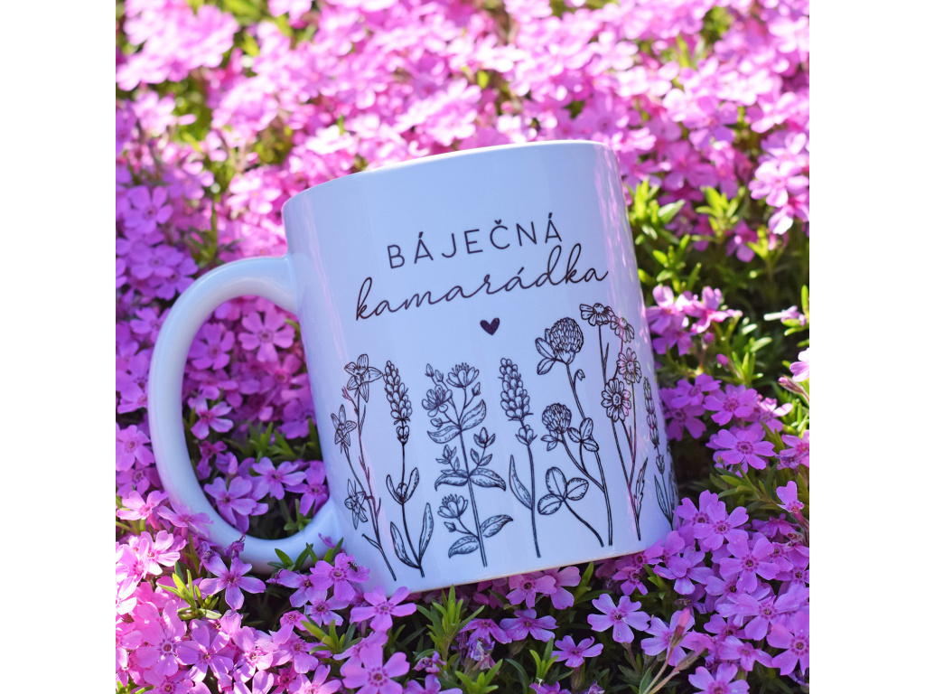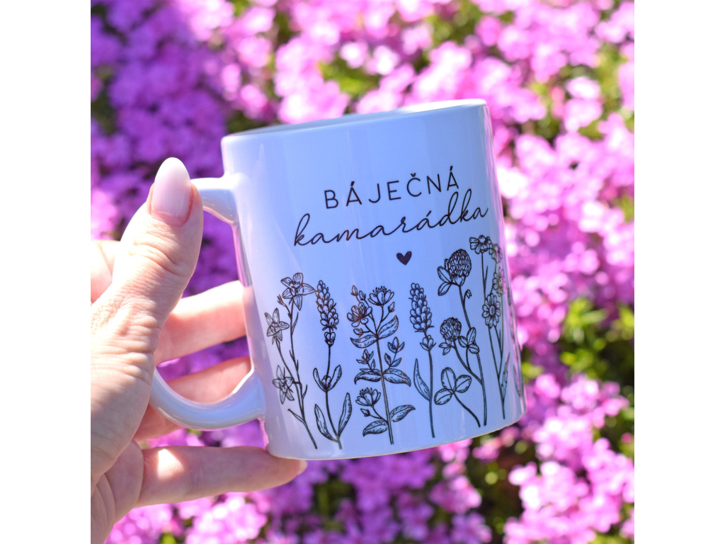 Decentní hrneček v černobílém provedení ozdobený kreslenými květy z louky.