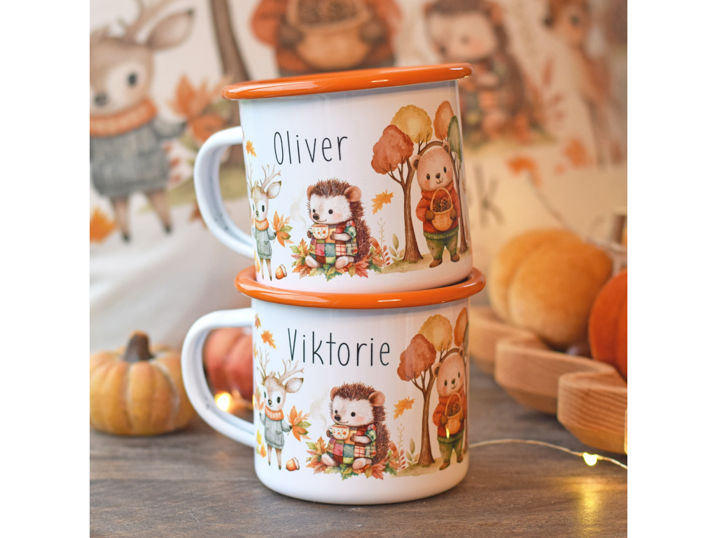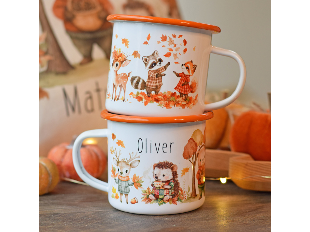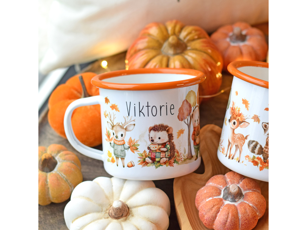 Pěkný smaltovaný hrnek s oranžovým okrajem zdobí  ručně malovaná zvířátka, která udělají radost. Zahřejte své děti v podzimním chmurném počasí teplým nápojem z tohoto originálního plecháčku.
