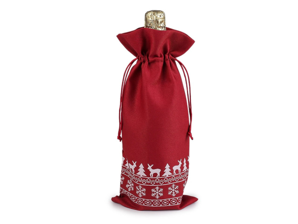 Vánoční dárkový pytlík je z obou stran ozdobený potiskem sobů, stromečků a vloček. Je určený na zabalení lahví a jiných podlouhlých dárků. Pytlík je dostatečně vysoký, ať už se rozhodnete pro dárek s alkoholem nebo s domácí limonádou, ušetří vám čas při balení. Stahuje se pomocí kulatých saténových šňůrek, dárku dodá osobní kouzlo a půvab.