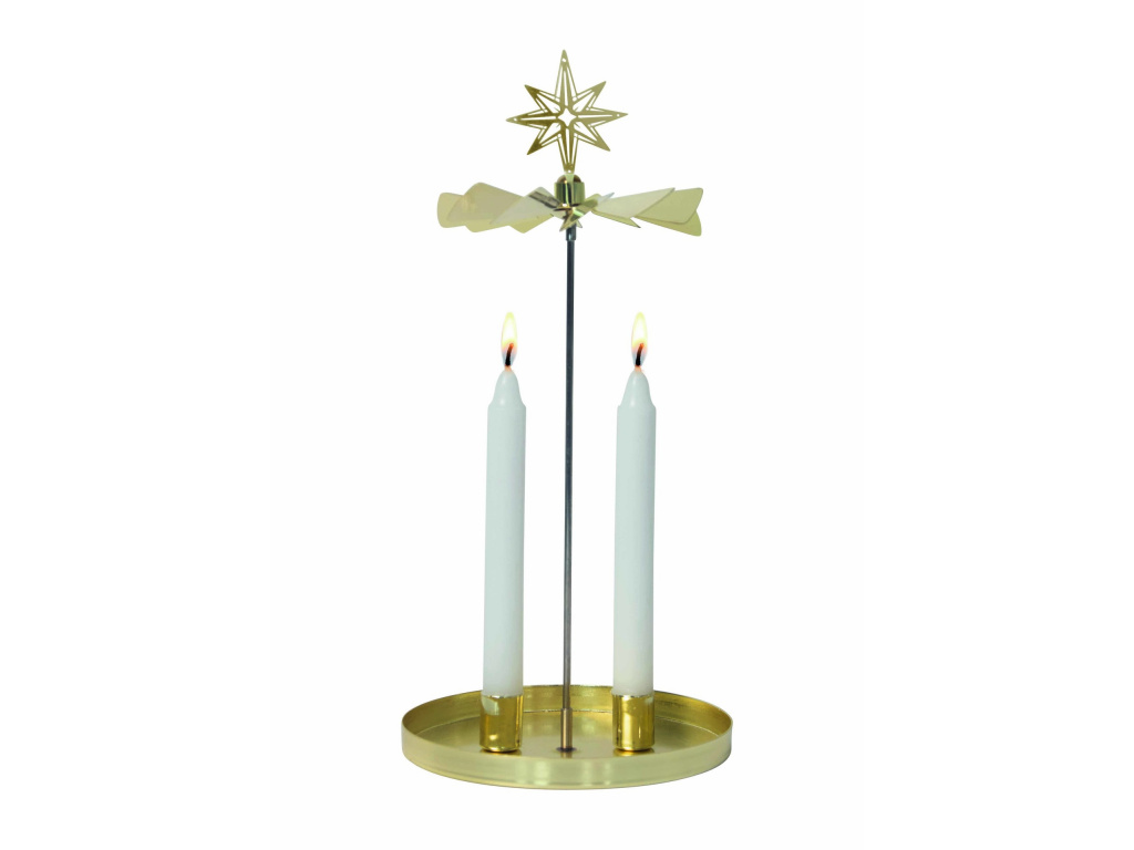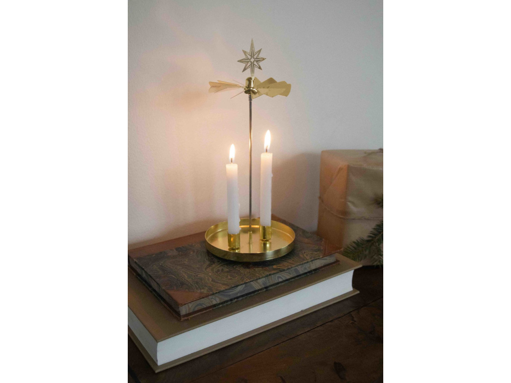 Klasická andělská zvonkohra ze zlatého kovu s malými kostelními svíčkami dodává místnosti magickou atmosféru.