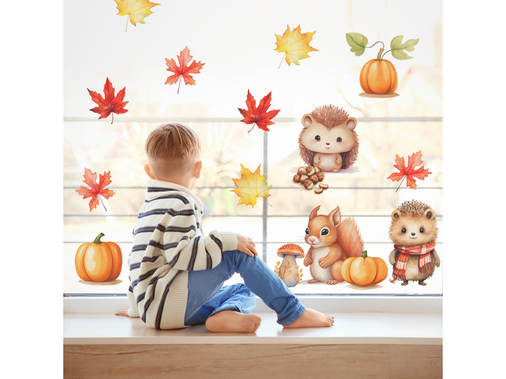 Tato samolepka bude skvělým doplňkem do podzimních pokojíčků! Udělá radost dětem a zútulní vaše bydlení. Obsahuje tři zvířátka, sadu barevných lístků a podzimní dýně.