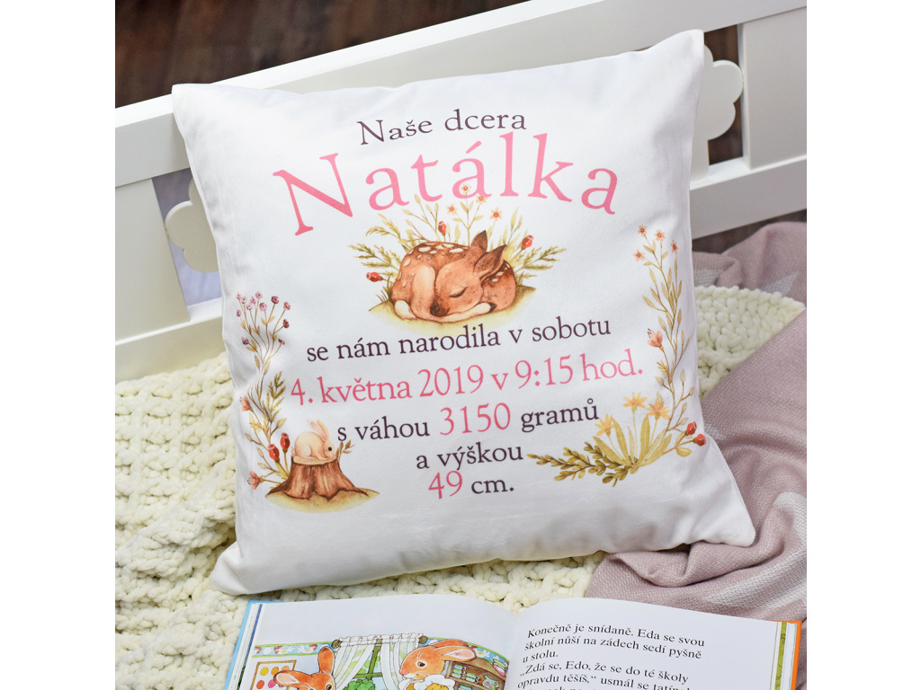 Jedinečná záležitost pro Vaše ratolesti. Měkoučký polštář v něžném designu je nejen hebký společník, ale i krásná památka na narození Vašeho děťátka.