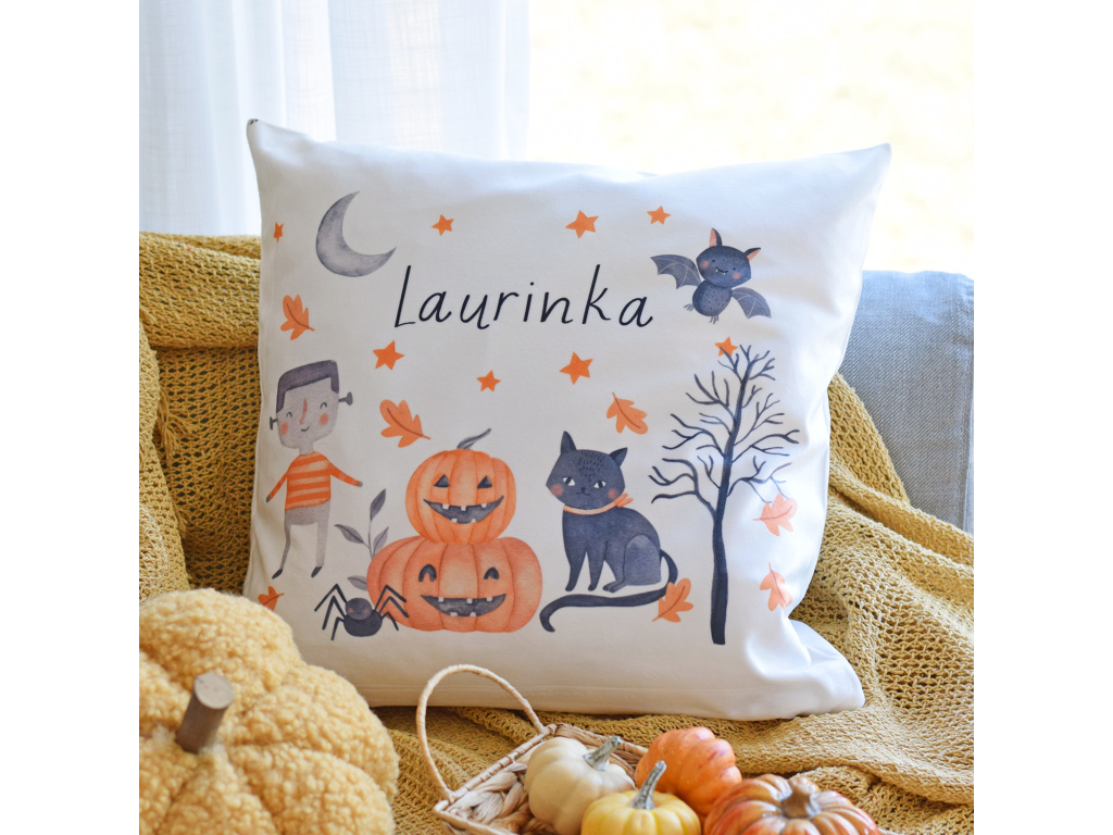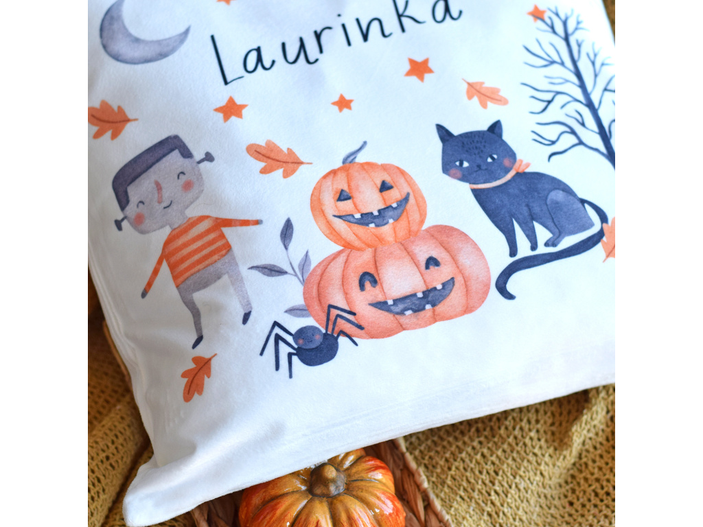 Představujeme dětský polštářek s podzimními obrázky strášáků doprovázené kočičkou a strašidlem!