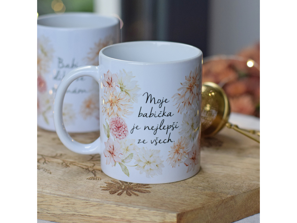 Keramický hrnek zdobený jemnými malovanými květy a doplněn o český text je skvělý dárkem pro babičku.