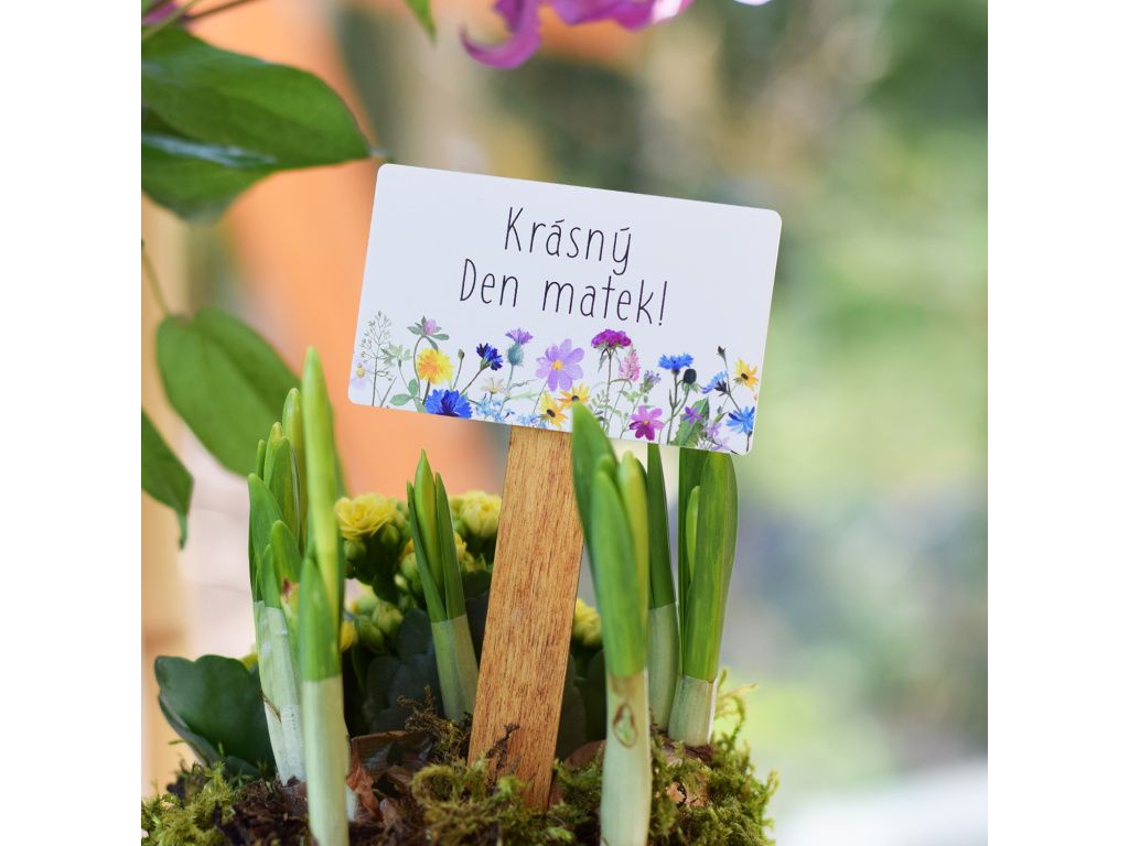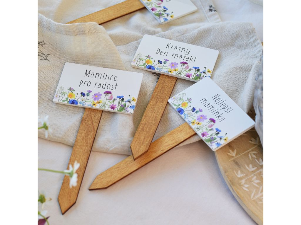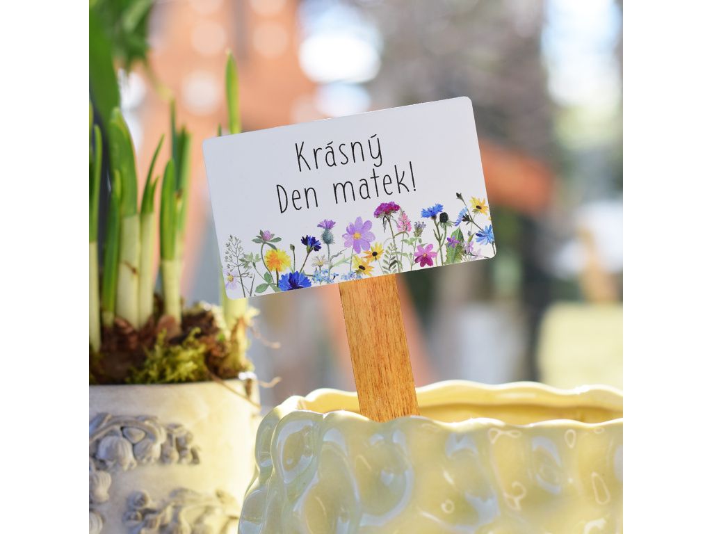 Potěšte maminku milým detailem, který rozzáří každý květináč. Dřevěný zápich s něžným motivem lučního kvítí a nápisem „Krásný Den matek!“ je krásným doplňkem ke květině i samostatným drobným dárkem.