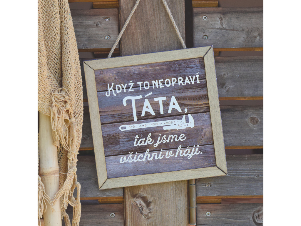 Dřevěná cedulka s rámečkem pro všechny tatínky. Pokud právě váš tatínek je typ kutila a šikovného opraváře, pak ho jistě potěší tato dřevěná cedule s českým vtipným textem.   Velikost: 26 x 26 cm