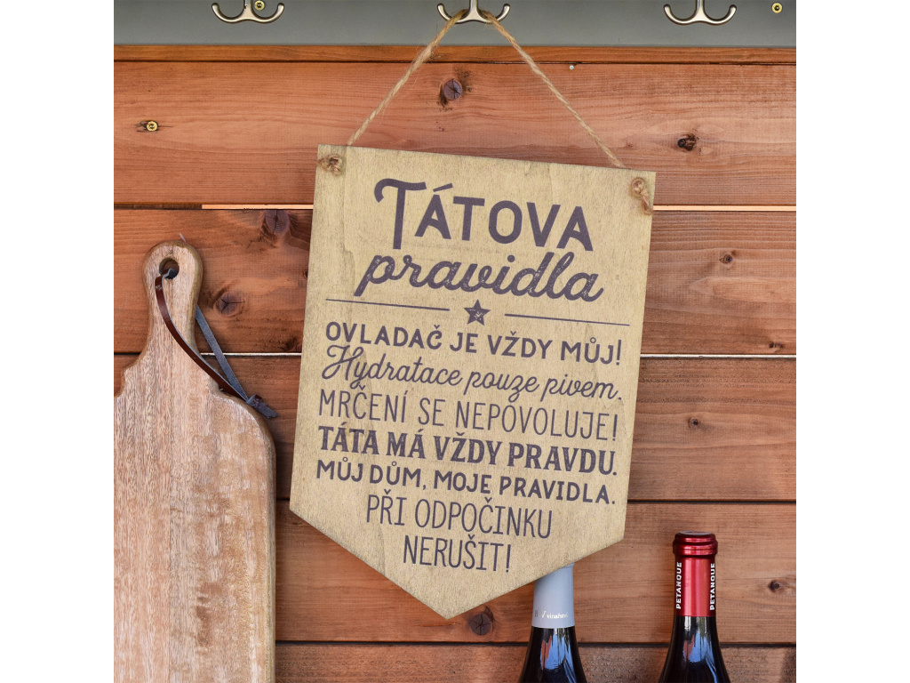 Dřevěná cedulka s tátovými pravidly. Super doplněk pro tatínka, nad kterým se zaručeně zasměje.