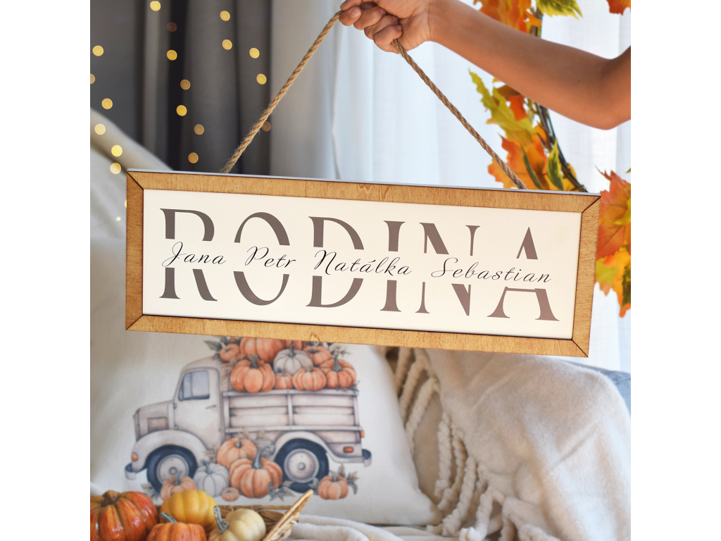 Tato cedule se jmény členů rodiny ozdobí originálně váš domov! Dřevěná cedule dekorovaná lazurovaným rámem a jutovým lanem je krásný přírodní doplněk, který se hodí do každé domácnosti.