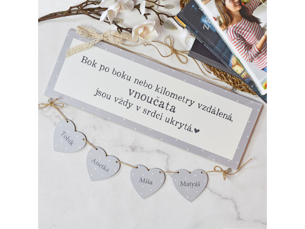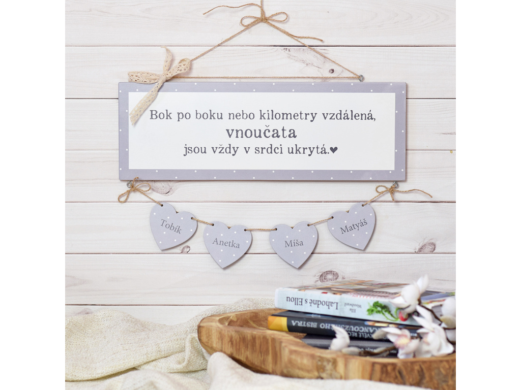 Originální dekorativní cedulka na míru s jemným moderním motivem a oblíbeným citátem. Ať jsou Vaše vnoučátka kdekoliv, stále zůstávají s Vámi. Součástí balení jsou přírodní jutové provázky.   materiál: dřevo velikost 40 x 45 cm   - do poznámky napište jména, která chcete mít na srdíčkách