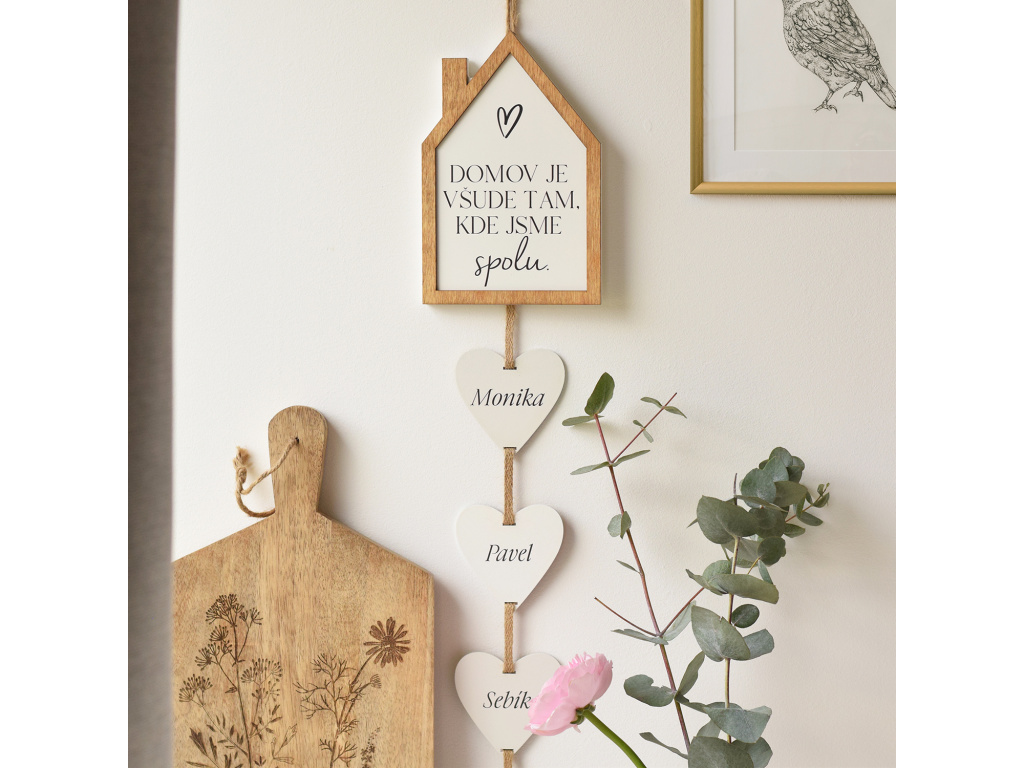 Dřevěná dekorace na míru, která bude ve vašem domově srdcovou záležitostí. Obsahuje totiž srdíčka, na která vám upravíme jména členů vaší rodiny.