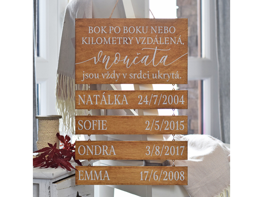 Originální dřevěná cedule pro všechny babičky a dědečky! Skvělý dárek, který doopravdy potěší. Můžete volit hned ze dvou citátů, které jistě chytí za srdce. Součástí cedulky jsou kovové kroužky, kterými snadno spojíte všechny jména vnoučátek v pořadí jakém chcete.    *velikost cedulky na fotce - 43 x 29 cm (rozměry bez lana)   *Jména vnoučátek a data jejich narození uvádějte vždy při vyplnění objednávky v kolonce zpráva pro grafika.
