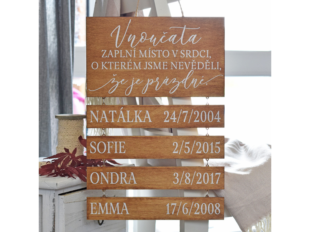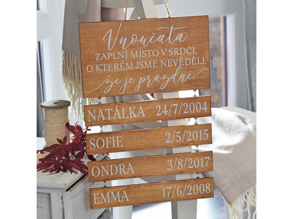 Originální dřevěná cedule pro všechny babičky a dědečky! Skvělý dárek, který doopravdy potěší. Můžete volit hned ze dvou citátů, které jistě chytí za srdce. Součástí cedulky jsou kovové kroužky, kterými snadno spojíte všechny jména vnoučátek v pořadí jakém chcete.    *velikost cedulky na fotce - 43 x 29 cm (rozměry bez lana)   *Jména vnoučátek a data jejich narození uvádějte vždy při vyplnění objednávky v kolonce zpráva pro grafika.