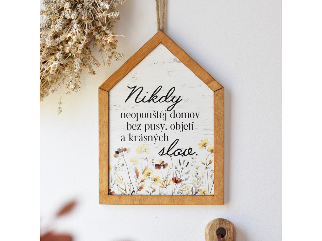 Dřevěný domeček s květinami v podzimních tónech a oblíbeným citátem: "Nikdy neopouštěj domov bez pusy, objetí a krásných slov."