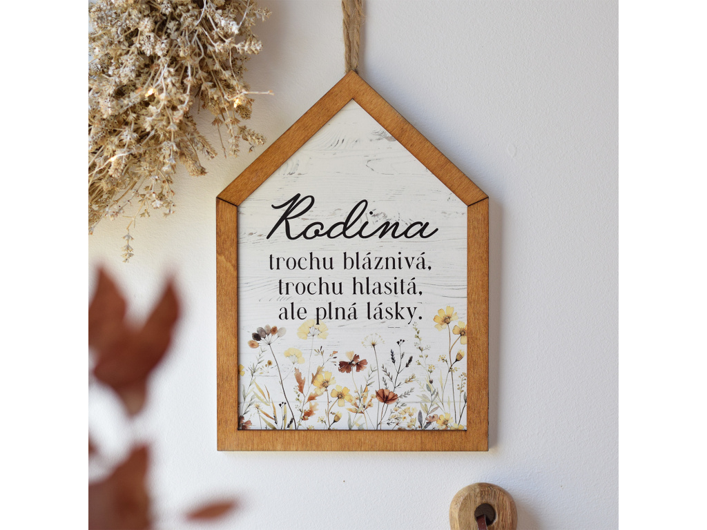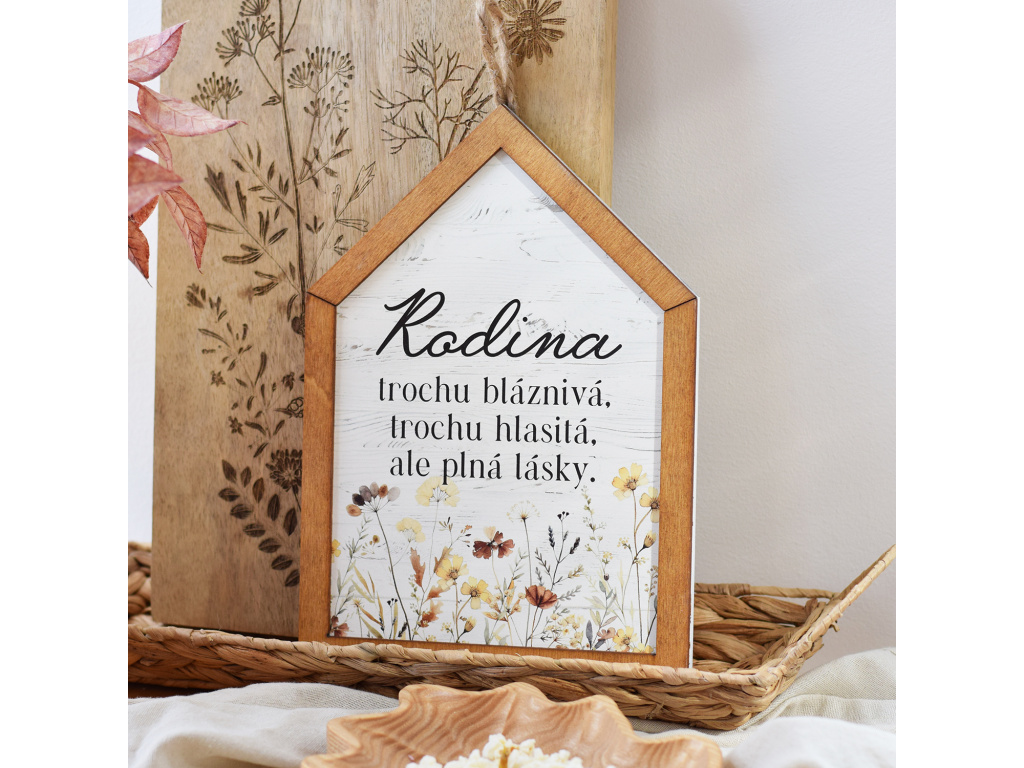 Dřevěný domeček s květinami v podzimních tónech a oblíbeným citátem: "Rodina...Trochu bláznivá, trochu hlasitá, ale plná lásky."