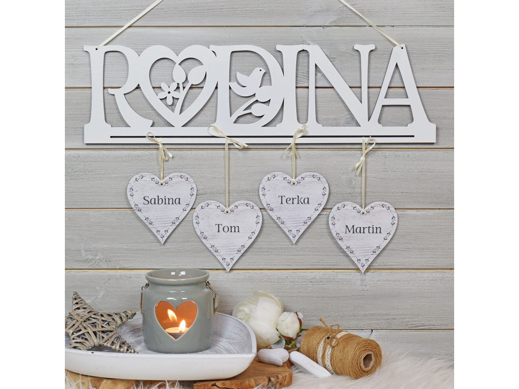 Rodinná závěsná dekorace se jmény členů rodiny. Oblíbený výrobek v novém kabátě.  - velký rozměr (šířka 50 cm) - na míru - originální dekorace - stužky jsou součástí balení   materiál: dřevo     Jména uveďte do poznámky při vyplnění objednávky. Dekoraci Vám zpracujeme na míru.