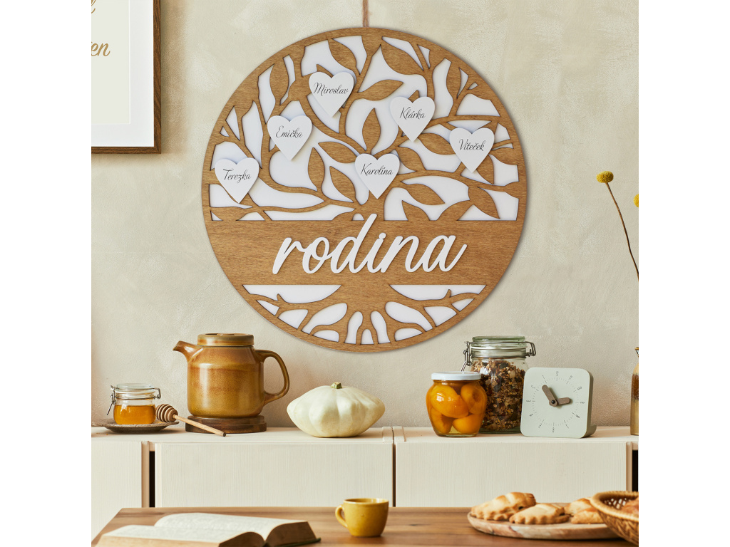 Rodina - strom se srdíčky (přírodní hnědá) Dřevěné dekorace jsou naší láskou a stále se snažíme vymýšlet nové originální kousky, které ozdobí váš domov. S každou dekorací také dbáme na trendy a kvalitu zpracování. Představujeme další variantu stromu se srdíčky, tentokrát pro celou rodinu :) Vyzdobte si domov touto moderní dekorací, kterou vám připravíme na míru. průměr: 40 cm Tato dekorace je vybavena jutovým provázkem pro zavěšení. Jména Vám do srdíček rádi zpracujeme na míru. Stačí je zadat do pozámky k produktu na míru při zpracování objednávky. MOHLO BY VÁS ZAJÍMAT : ➤ Cedulky ➤ Rodinné dekorace ➤ Šedá varianta ➤ Varianta "vnoučata"