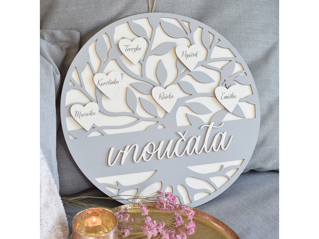 Vnoučata - strom se srdíčky (šedá) Dřevěné dekorace jsou naší láskou a stále se snažíme vymýšlet nové originální kousky, které ozdobí váš domov. S každou dekorací také dbáme na trendy a kvalitu zpracování.   Představujeme další variantu stromu se srdíčky, tentokrát v šedém zpracování :) Vyzdobte si domov touto moderní dekorací, kterou vám připravíme na míru.  průměr: 40 cm varianta v šedé barvě Tato dekorace je vybavena jutovým provázkem pro zavěšení.  Jména Vám do srdíček rádi zpracujeme na míru. Stačí je zadat do pozámky k produktu na míru při zpracování objednávky. MOHLO BY VÁS ZAJÍMAT : ➤ Cedulky ➤ Rodinné dekorace ➤ Hnědá varianta ➤ Varianta "rodina"