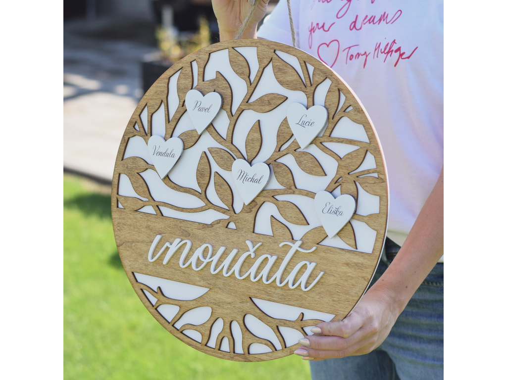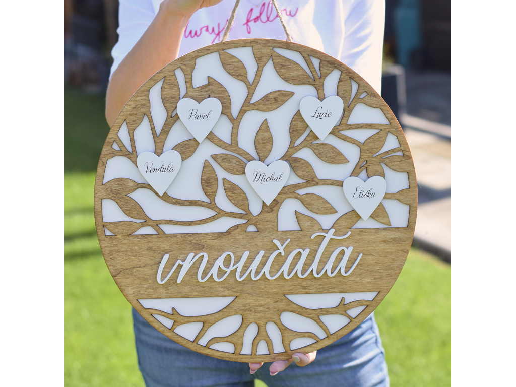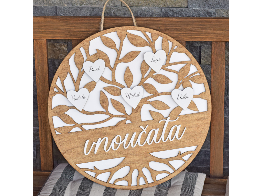 Vnoučata - strom se srdíčky Dřevěné dekorace jsou naší láskou a stále se snažíme vymýšlet nové originální kousky, které ozdobí váš domov. S každou dekorací také dbáme na trendy a kvalitu zpracování.   Představujeme takový rodinný emblém ve tvaru stromu a se jmény vnoučat. Skládá se hned ze tří vrstev a je vskutku důsledně provedený tak, aby mohl zdobit domov vaší babičky nebo dědečka.  průměr: 40 cm Tato dekorace je vybavena jutovým provázkem pro zavěšení.  Jména Vám do srdíček rádi zpracujeme na míru. Stačí je zadat do pozámky k produktu na míru při zpracování objednávky.  MOHLO BY VÁS ZAJÍMAT : ➤ Dekorační cedule ➤ Rodinné kalendáře ➤ Rodinné dekorace ➤ XXL hodiny ➤ Dětské dekorace ➤ Svítící dekorace