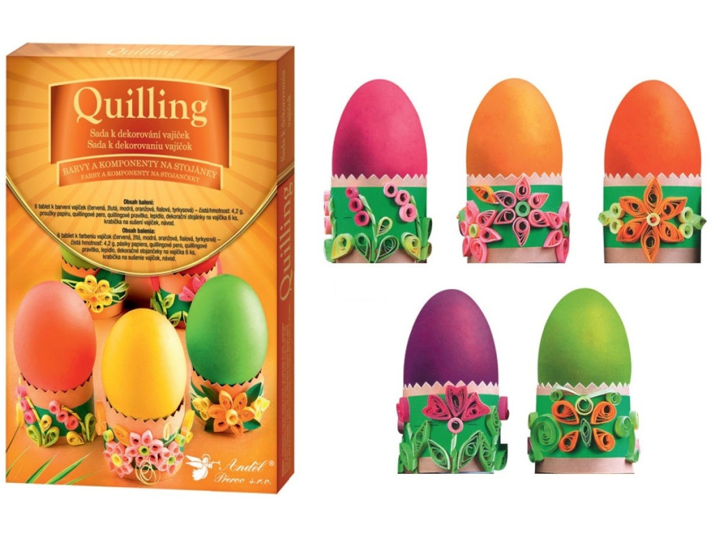 Sada k dekorování vajíček - quilling Sada pro šikovné ruce BARVY A KOMPONENTY NA STOJÁNKY Obsah balení: 6 tablet k barvení vajíček 4,2 g (červená, žlutá, modrá, oranžová, fialová, tyrkysová), proužky papíru, quillingové pero, quillingové pravítko, lepidlo, dekorační stojánky na vajíčka 6 ks, krabička na sušení vajíček, návod.