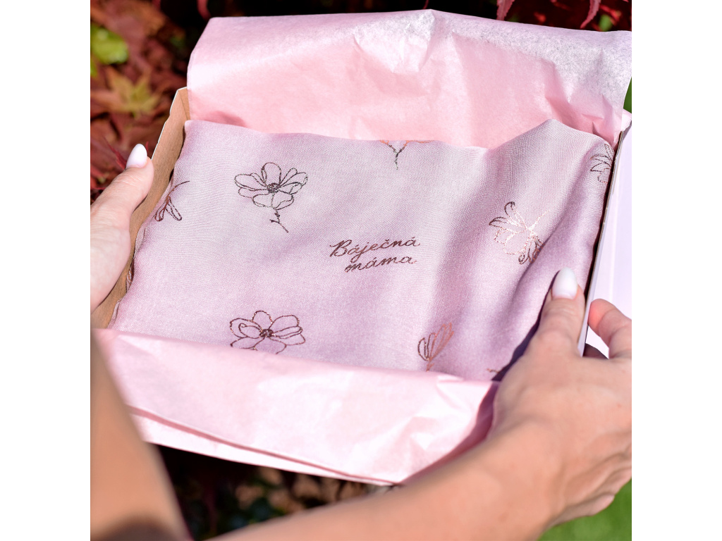 Šátek je zabalen do dárkové krabičky se zlatou ražbou s věnováním "Báječné mamince".
