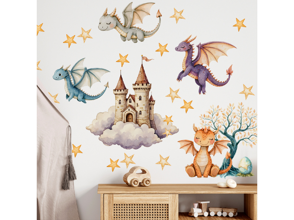 Proměňte dětský pokoj v pohádkový svět plný fantazie. Samolepka Dračí království přináší roztomilé dráčky, kouzelný hrad v oblacích a zářivé hvězdy, které společně vytvářejí hravou a snovou atmosféru. Jemné akvarelové barvy působí něžně a zároveň podněcují dětskou představivost a chuť objevovat nové příběhy.