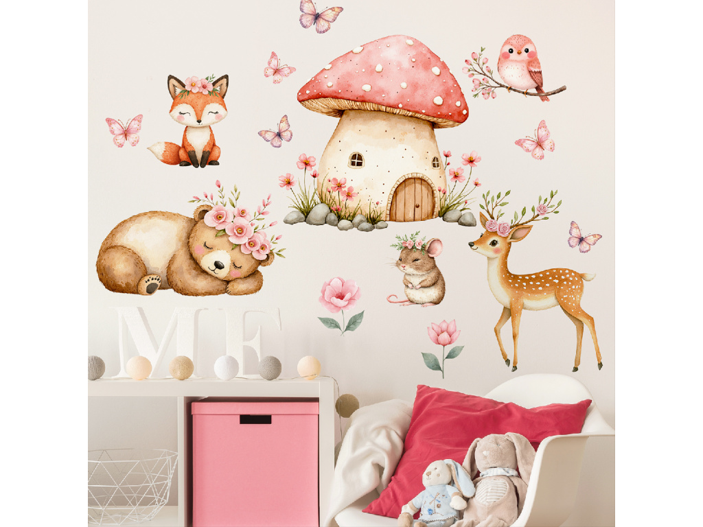 Vneste do dětského pokoje kouzelnou atmosféru pohádkového lesa. Samolepka Lesní domeček zachycuje něžný svět zvířátek, květin a motýlků, kde uprostřed stojí malý houbový domek jako z pohádky. Jemné pastelové barvy a milé ilustrace vytvářejí klidné a harmonické prostředí, ve kterém se děti cítí bezpečně a příjemně.