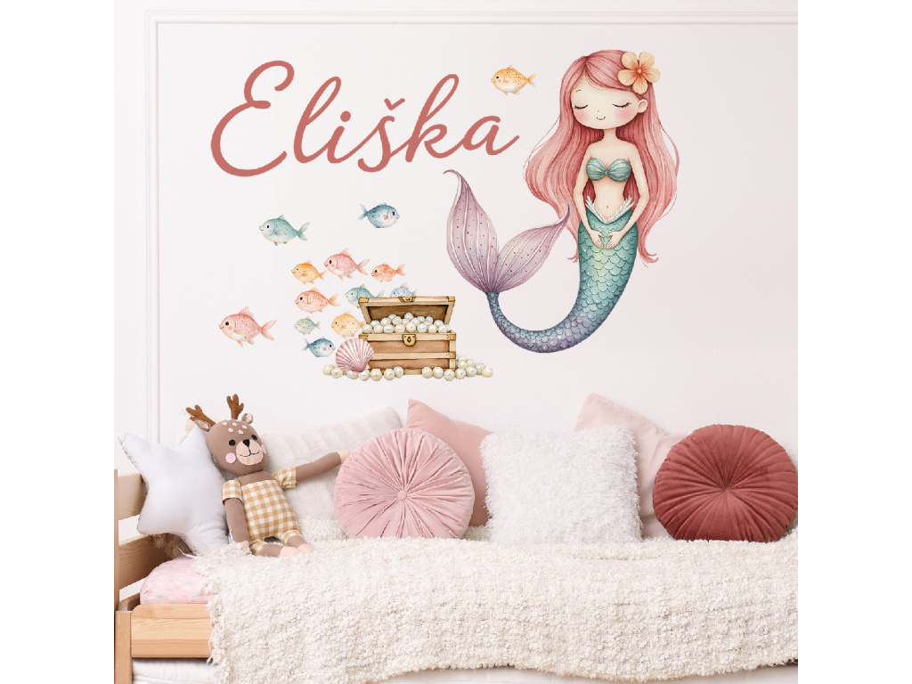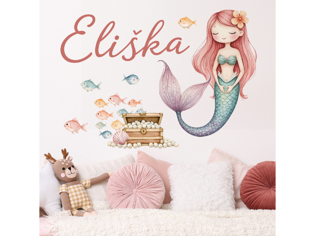 Vytvořte dětský pokoj plný jemné fantazie a pohádkové atmosféry. Samolepka Mořská víla se jménem je krásnou dekorací, která prostor zútulní a zároveň ho promění v kouzelný podmořský svět. Něžná ilustrace víly, rybiček a pokladu působí lehce a harmonicky, takže se hodí do pokojíčku malých i větších slečen.