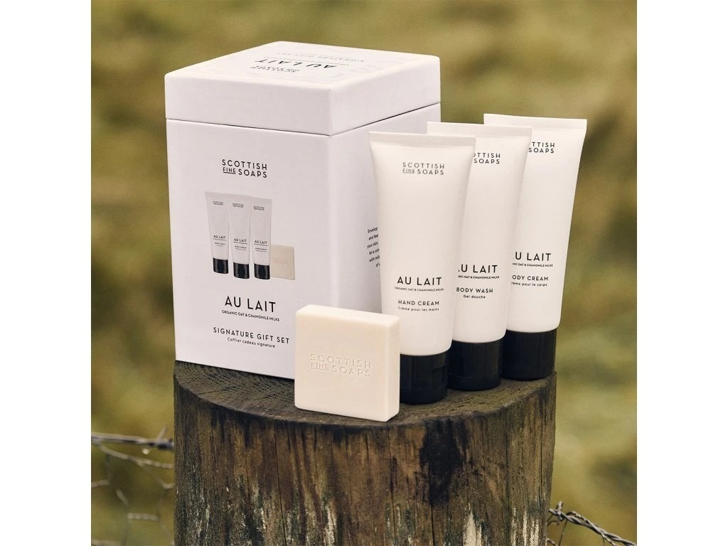 Au Lait sada ukrývá čtyři produkty v praktickém balení, které pečují o pokožku od hlavy až k patě. Čisticí sprchový gel, vyživující tělový krém, krém na ruce s bambuckým máslem a jemné tuhé mýdlo s ovesným mlékem a extraktem z heřmánku vytvářejí harmonický celek pro každodenní pečující rituál.