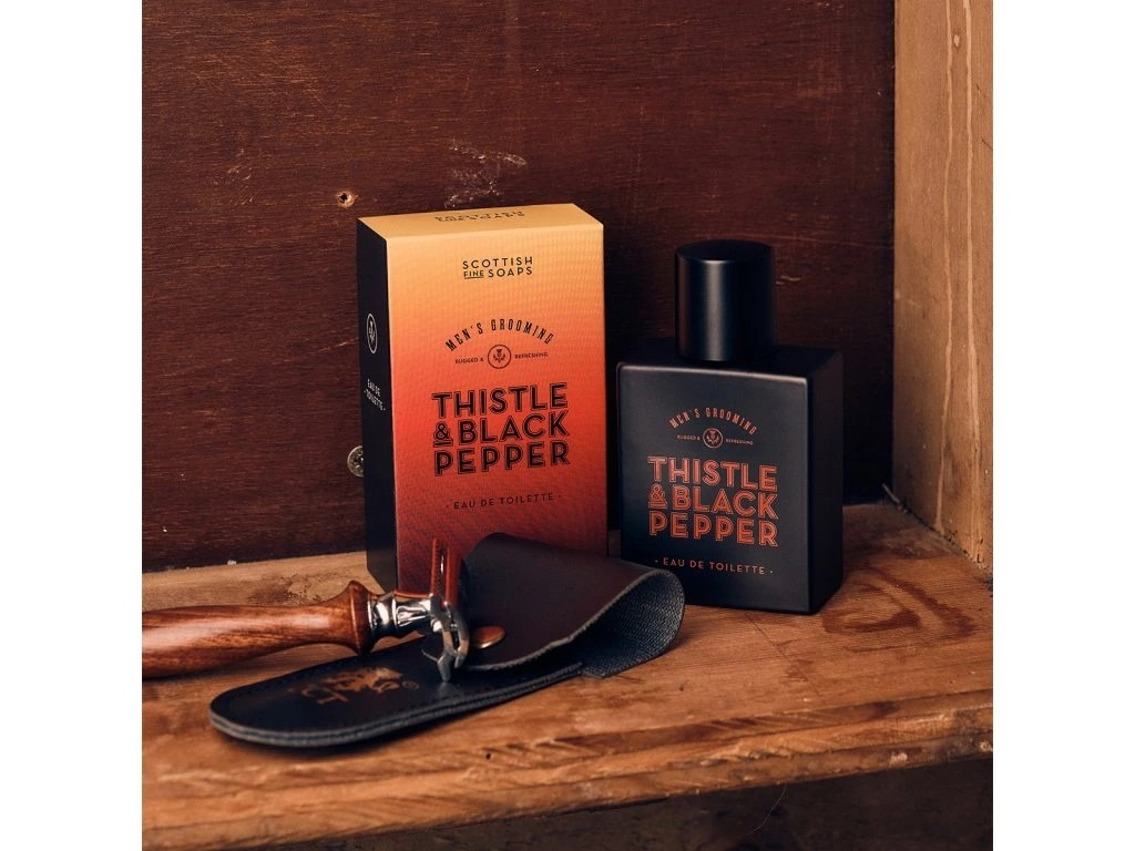 Pánská toaletní voda Thistle & Black Pepper otevírá svou kompozici svěžími tóny citrusů, bylinek, rakytníku a černého pepře, které okamžitě probudí smysly. V srdci vůně rozkvétají květinové akordy růže, geránia, konvalinky a levandule, které přinášejí jemný kontrast k výraznému základu. Ten tvoří hřejivé tóny whisky, ambry, santalového dřeva, pižma, tonka fazolí a mechu, které na pokožce zanechají mužnou stopu.