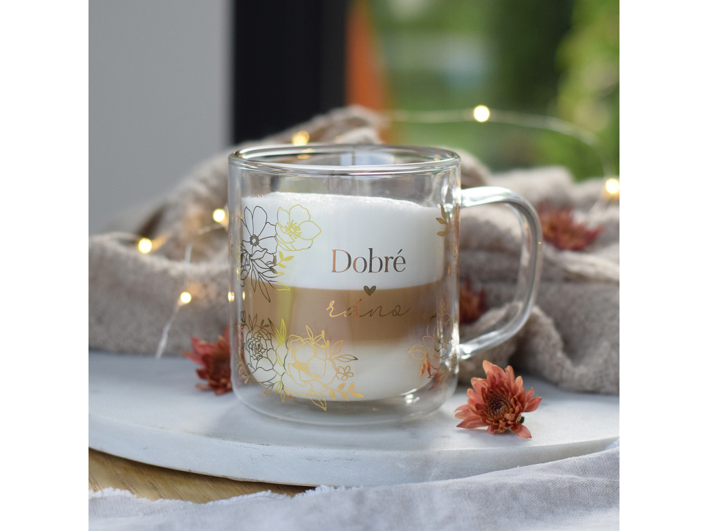 Hrneček je vyroben z dvouplášťového skla, tudíž izoluje teplotu nápoje. A teď to nejlepší - Je ozdoben zlatými květinami po celém svém obvodu a samozřejmě vybaven českým nápisem.